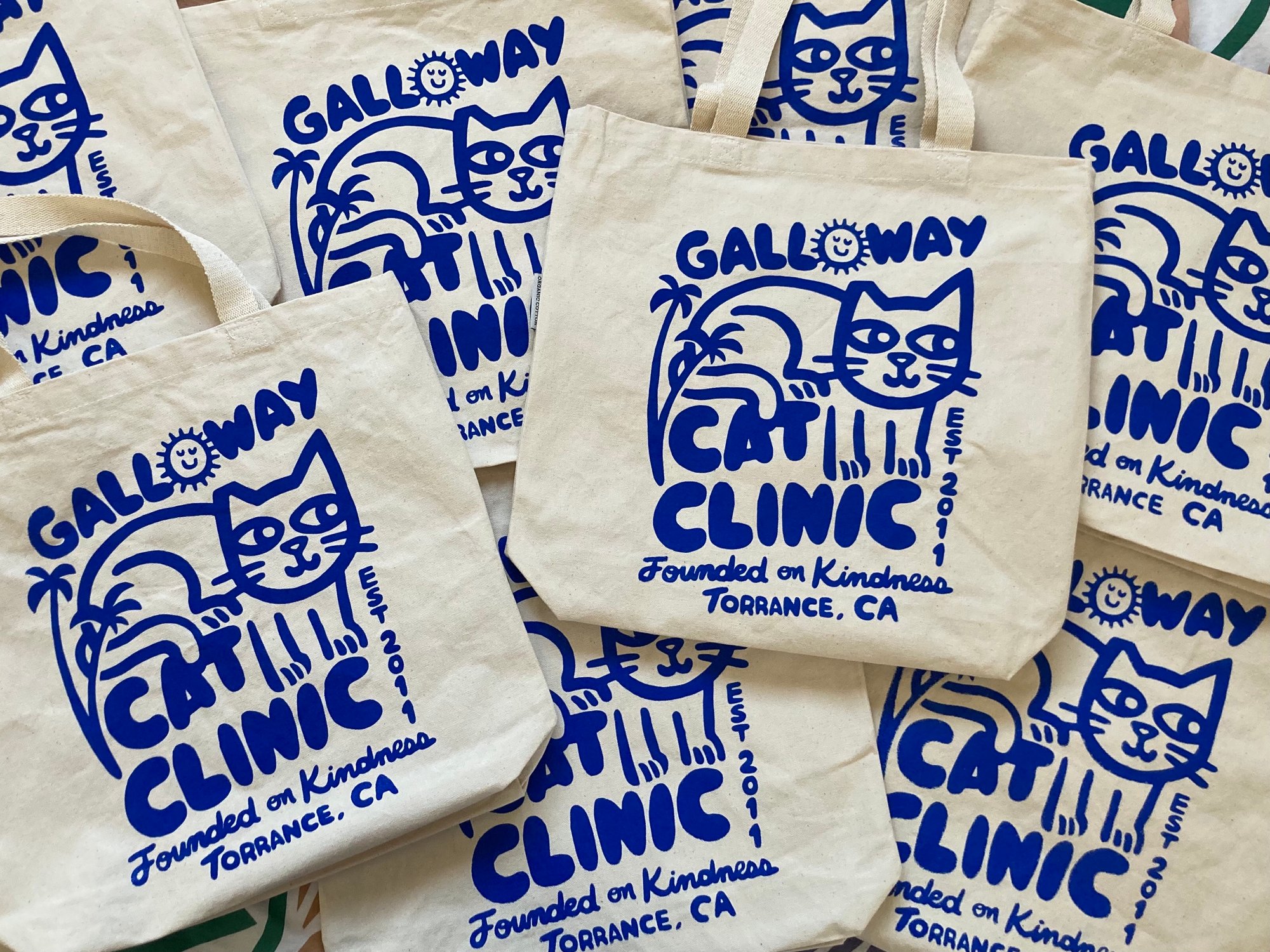 These shirts and totes are available now, only in person at the Galloway Cat Clinic.